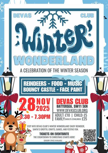 Step into the festive season with Devas Club’s magical Winter Wonderland! Enjoy an afternoon of reindeers, music, food, a bouncy castle, face painting, Santa’s grotto, crafts, and family fun in Battersea. A brilliant community event for all ages, running from 3:30pm to 7:30pm.