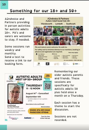 A2ndvoice and partners provide welcoming, in-person activities for autistic adults aged 18+ across Wandsworth, Lambeth, and Southwark. Sessions include arts & crafts, gaming, open mic, picnics, water sports, workshops, and more. PAs and carers are welcome to attend. We also host a monthly online meet-up for autistic adults aged 50+, offering themed discussions in a supportive, non-recorded environment.