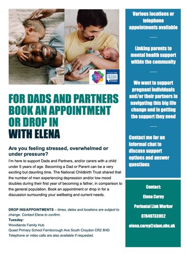 Croydon Family Hub and Croydon NHS Talking Therapies offer tailored support for dads, partners, and carers of children under five. Becoming a parent can be both exciting and overwhelming, and this service provides a safe space to talk about wellbeing, stress, and low mood. Appointments and drop-ins are available with Perinatal Link Worker, Elena Carey, at the Woodlands Family Hub in South Croydon, with telephone and video sessions also available on request.