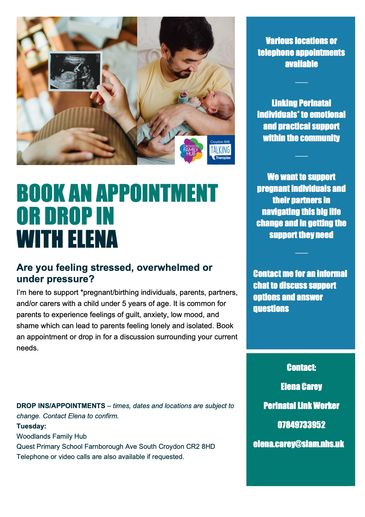 Croydon Family Hub and Croydon NHS Talking Therapies also provide dedicated wellbeing support for pregnant and birthing individuals, parents, partners, and carers of children under five. This service offers a safe, understanding space to talk through feelings such as anxiety, low mood, guilt, or isolation. Appointments and drop-ins are available with Perinatal Link Worker, Elena Carey, at the Woodlands Family Hub in South Croydon, with the option of telephone or video calls if preferred.