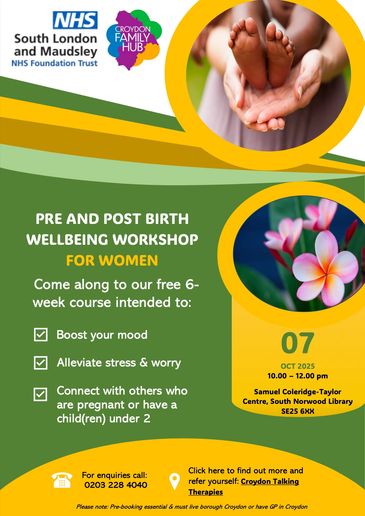South London and Maudsley NHS Foundation Trust, together with Croydon Family Hub, are offering a free six-week Pre and Post Birth Wellbeing Workshop for women. Starting on 7th October 2025 at the Samuel Coleridge-Taylor Centre, the course is designed to boost mood, ease stress and worry, and provide a supportive space to connect with other women who are pregnant or caring for a child under two.