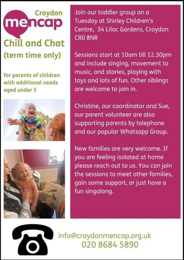 Croydon Mencap run a welcoming Chill and Chat group for parents of children under 5 with additional needs. Held on Tuesdays at Shirley Children’s Centre, sessions include singing, stories, play, and lots of fun activities for little ones, while also offering a chance for parents to connect and gain support. Families can also join their WhatsApp group or get support by phone.