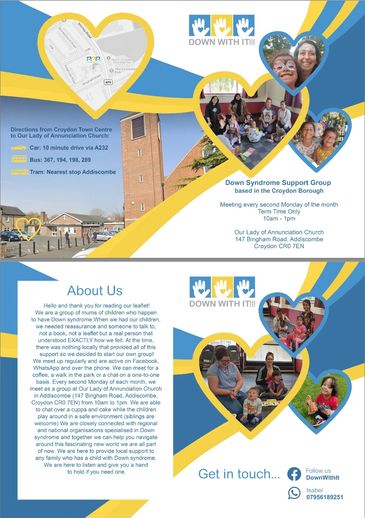 Down With It is a welcoming parent-led Down Syndrome Support Group based in Croydon. Set up by local mums, the group provides reassurance, friendship, and practical support for families with a child who has Down syndrome. They meet every second Monday of the month (term time only) from 10am–1pm at Our Lady of Annunciation Church in Addisc