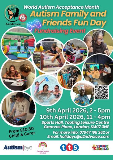 Autism Family & Friends Fun Day is a fun, inclusive fundraising event for autistic children and their families, taking place at Tooting Leisure Centre (Sports Hall, Greaves Place, SW17 0NE) on 9th April 2026 (2–5pm) and 10th April 2026 (11am–4pm), with tickets from £10.50 for a child and carer; hosted by A2ndvoice CIC in support of World Autism Acceptance Month, the event offers sensory-friendly activities, soft play, arts and crafts, gaming, music and social spaces, all aimed at creating safe, accessible environments while raising funds for autism and ADHD-friendly family activities in the Croydon community, with more information available via 07947 198 362 or holidays@a2ndvoice.com.